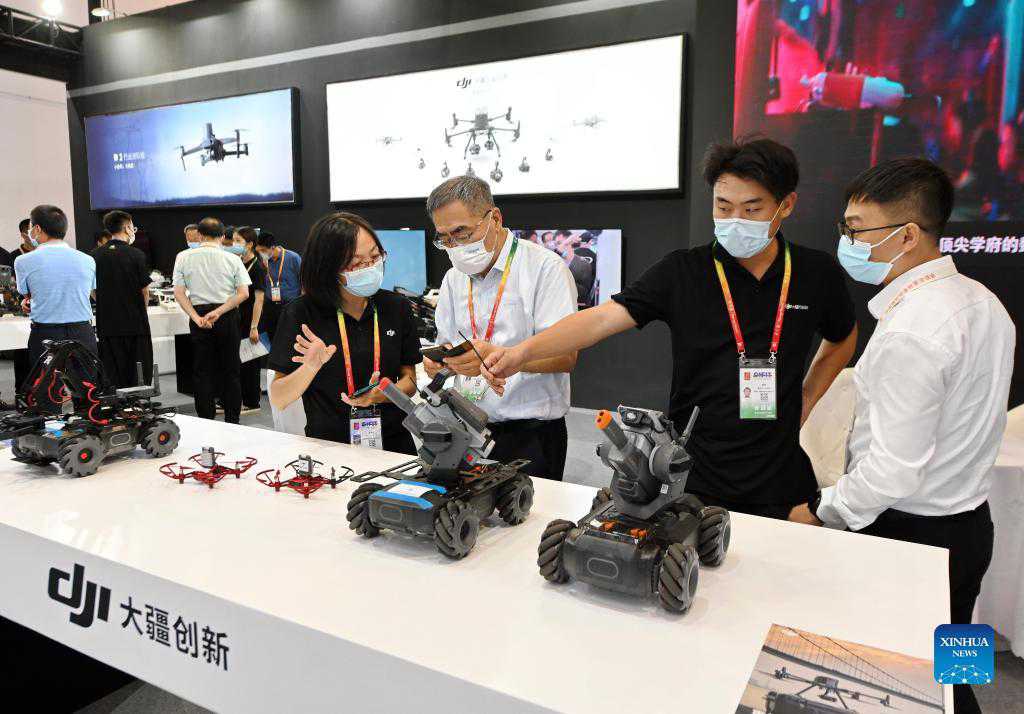 Visitors tour the booth of Chinese drone maker DJI during an exhibition on BRICS New Industrial Revolution held in Xiamen, southeast China's Fujian Province, Sept. 8, 2021. An exhibition on BRICS New Industrial Revolution kicked off in Xiamen, a port city in southeast China's Fujian Province on Wednesday. The exhibition covers an area of 10,000 square meters. BRICS is the acronym for an emerging-market bloc that groups Brazil, Russia, India, China and South Africa. (Xinhua/Lin Shanchuan)