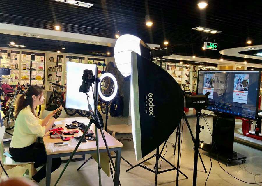 A staff member of Guangzhou Light Holdings Limited (GZLI) introduces exhibits via livestreaming during the 129th session of the China Import and Export Fair, in Guangzhou, south China's Guangdong Province, April 15, 2021. (Xinhua)