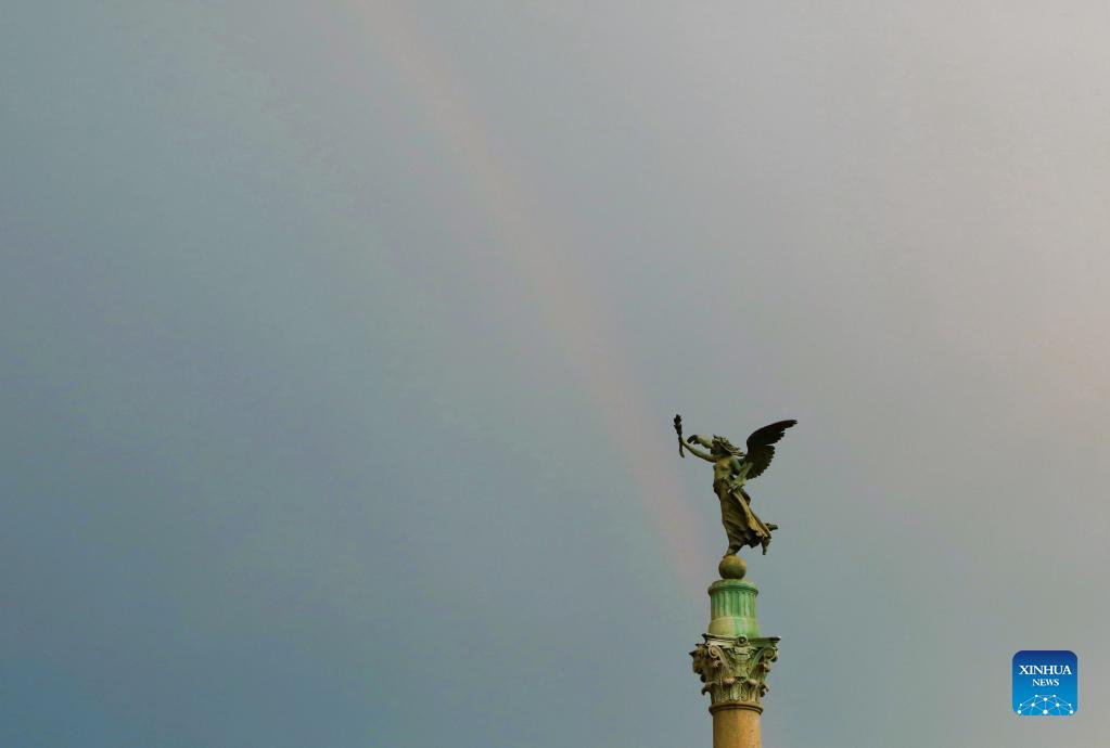 Photo taken on Sept. 8, 2021 shows a rainbow over the city in Rome, Italy. (Xinhua/Cheng Tingting)