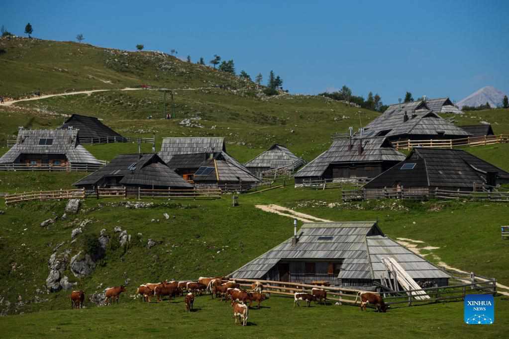 Herdsman huts and cows are seen in Velika planina, Kamnik, Slovenia, Sept. 8, 2021. Velika planina, a large Alpine settlement of shepherds in Europe, is a tourist destination on the Alpine pastures in Slovenia. (Photo by Zeljko Stevanic/Xinhua)