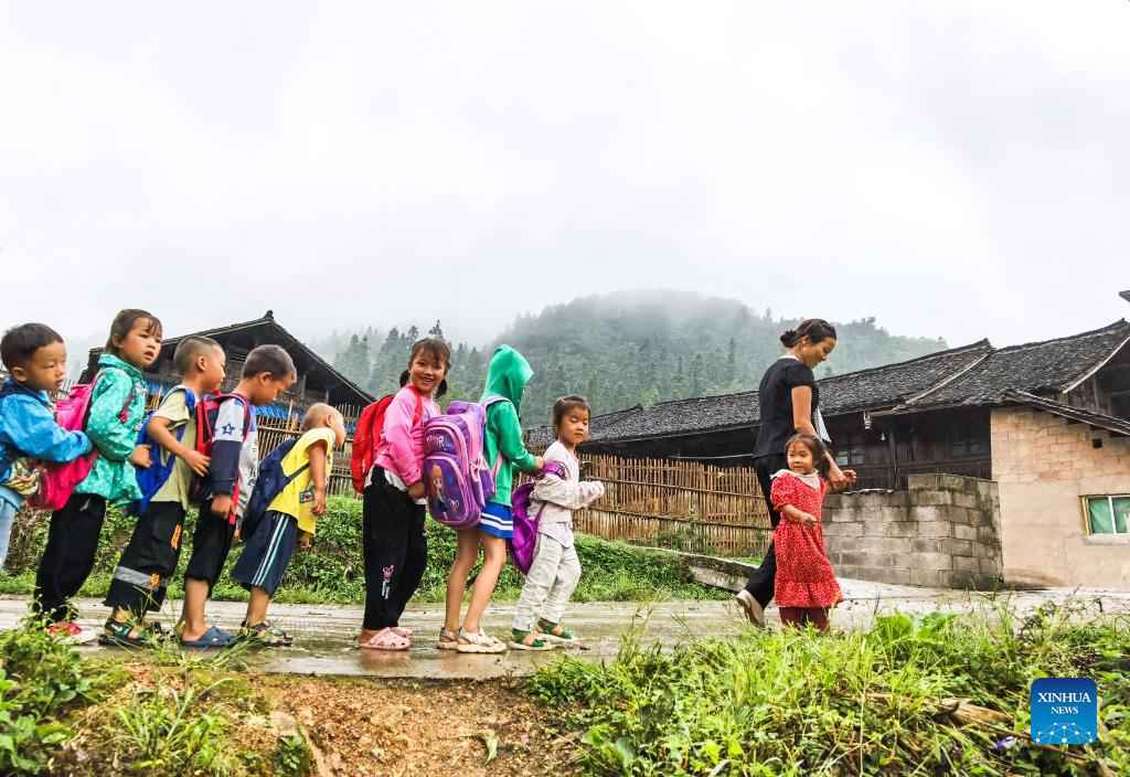 Cellphone photo taken on Sept. 7, 2021 shows Zhu Muqun escorting the children home from school at Pingyu teaching point of Songbai Village, Baojing Township of Zhenyuan County, southwest China's Guizhou Province. Located deep in the mountainous area of Zhenyuan County, Qiandongnan Miao and Dong Autonomous Prefecture, southwest China's Guizhou Province, the Pingyu teaching point is supported mainly by a couple. In 2000, Pan Zhongyong graduated from a normal school and came to Pingyu teaching point as a teacher. Later, he met and married Zhu Muqun, a girl in the village. Over the years, the couple was responsible for teaching, safety management, cooking and so on. With the integration of local educational resources in recent years, the number of students in Pingyu teaching point has been decreasing. There are only 20 lower-grade students at the teaching point this semester. Nevertheless, the couple decides to stay as teachers to bring convenience for the children and their parents. (Xinhua/Yang Wenbin)