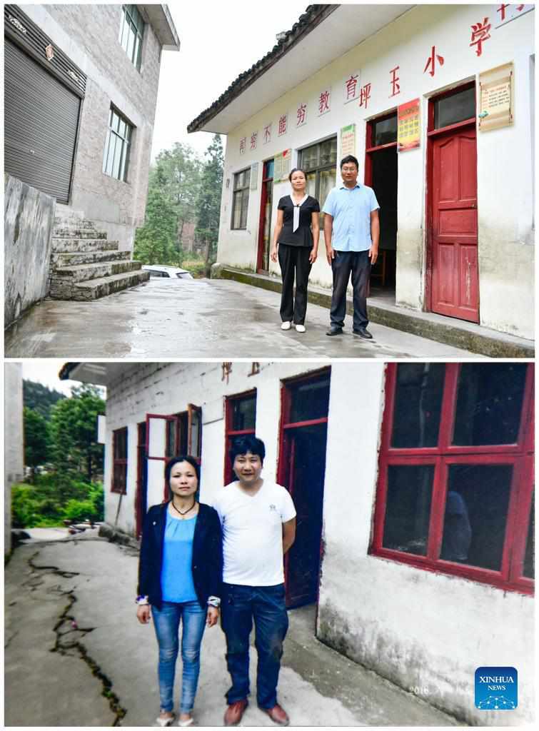 Combination photo shows Pan Zhongyong and Zhu Muqun posing for a photo at Pingyu teaching point of Songbai Village, Baojing Township of Zhenyuan County, southwest China's Guizhou Province, on Sept. 7, 2021 (upper), and June 1, 2016 (lower, copy photo). Located deep in the mountainous area of Zhenyuan County, Qiandongnan Miao and Dong Autonomous Prefecture, southwest China's Guizhou Province, the Pingyu teaching point is supported mainly by a couple. In 2000, Pan Zhongyong graduated from a normal school and came to Pingyu teaching point as a teacher. Later, he met and married Zhu Muqun, a girl in the village. Over the years, the couple was responsible for teaching, safety management, cooking and so on. With the integration of local educational resources in recent years, the number of students in Pingyu teaching point has been decreasing. There are only 20 lower-grade students at the teaching point this semester. Nevertheless, the couple decides to stay as teachers to bring convenience for the children and their parents. (Xinhua/Yang Wenbin)