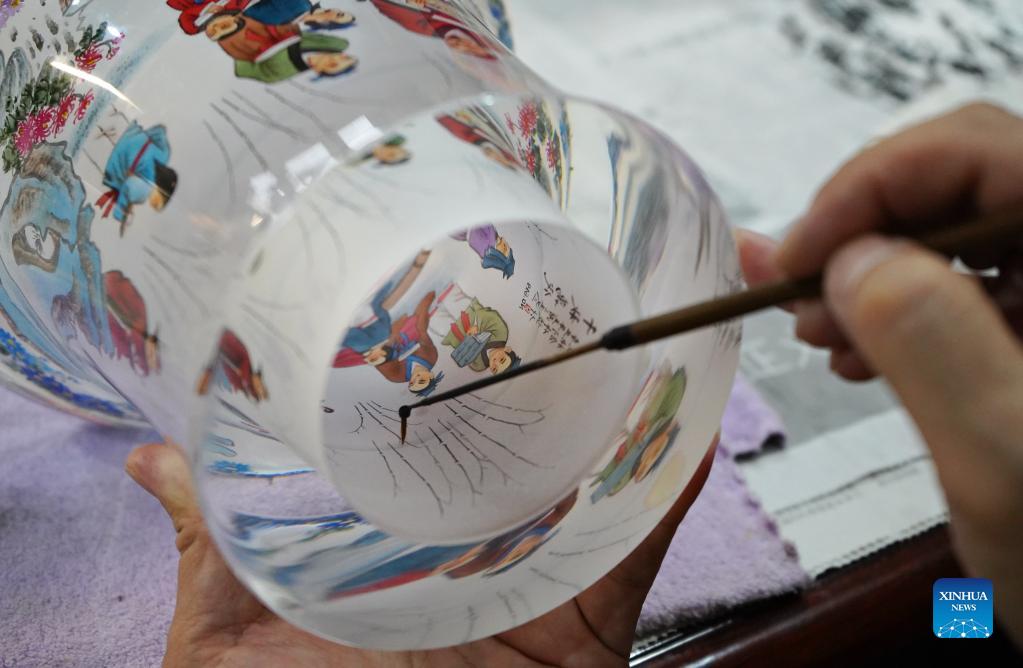 Wang Ziyong creates inside painting works on the inside surface of a bottle at a museum featuring inside paintings in Taocheng District of Hengshui City, north China's Hebei Province, Sept. 4, 2021. Inside painting, or inner painting, is a traditional Chinese art form. It originally involves tiny snuff bottles which have pictures and calligraphy painted on the inside surface of the bottle. Snuff bottle paintings are produced by manipulating a specialized brush through the neck of the bottle. The process of painting, which is totally reversed inside the bottle, requires absolute precision from the artist. Wang Ziyong, 52, an inside painting craftsman, studied inside painting with his father Wang Ruicheng since childhood. After graduating from college, Wang returned to Hengshui City and devoted himself to the artwork. Thanks to years of practice, he quickly developed his own style. In order to better paint the color highlights and handle details, Wang developed a new type of brush, which improved the drawing efficiency. He also developed different styles to create inside painting, not only inside snuff bottles, but also inside pencil vases, crystal balls, tea sets and folding screens. In 1995, he gave up the traditional workshop-style production mode of inside painting and established a modern enterprise, integrating development, design, production, processing and sales of the artwork. In 2003, with the help of his father, Wang founded a museum in Hebei themed on inside paintings, showing the historical development and creative process of the art. In 2006, inside painting was added to the list of national intangible cultural heritages. In 2012, Wang Ziyong was named the inheritor of provincial intangible cultural heritage projects. During all these years, Wang has won many prizes with his innovative artwork, and offered training to 38 apprentices, trying to make this traditional skill shine a new light. "I hope more people can feel the charm of Hengshui inside painting in the future," Wang said. (Xinhua/Jin Haoyuan)