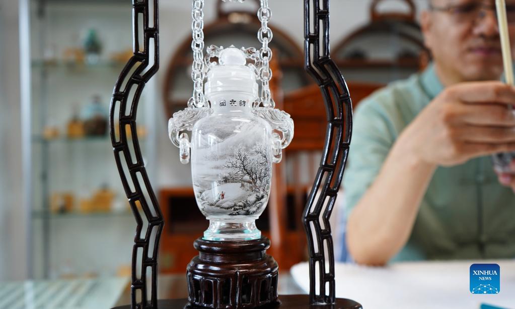 Photo taken on Sept. 4, 2021 shows inside painting works of Wang Ziyong at a museum featuring inside painting in Taocheng District of Hengshui City, north China's Hebei Province. Inside painting, or inner painting, is a traditional Chinese art form. It originally involves tiny snuff bottles which have pictures and calligraphy painted on the inside surface of the bottle. Snuff bottle paintings are produced by manipulating a specialized brush through the neck of the bottle. The process of painting, which is totally reversed inside the bottle, requires absolute precision from the artist. Wang Ziyong, 52, an inside painting craftsman, studied inside painting with his father Wang Ruicheng since childhood. After graduating from college, Wang returned to Hengshui City and devoted himself to the artwork. Thanks to years of practice, he quickly developed his own style. In order to better paint the color highlights and handle details, Wang developed a new type of brush, which improved the drawing efficiency. He also developed different styles to create inside painting, not only inside snuff bottles, but also inside pencil vases, crystal balls, tea sets and folding screens. In 1995, he gave up the traditional workshop-style production mode of inside painting and established a modern enterprise, integrating development, design, production, processing and sales of the artwork. In 2003, with the help of his father, Wang founded a museum in Hebei themed on inside paintings, showing the historical development and creative process of the art. In 2006, inside painting was added to the list of national intangible cultural heritages. In 2012, Wang Ziyong was named the inheritor of provincial intangible cultural heritage projects. During all these years, Wang has won many prizes with his innovative artwork, and offered training to 38 apprentices, trying to make this traditional skill shine a new light. "I hope more people can feel the charm of Hengshui inside painting in the future," Wang said. (Xinhua/Jin Haoyuan)