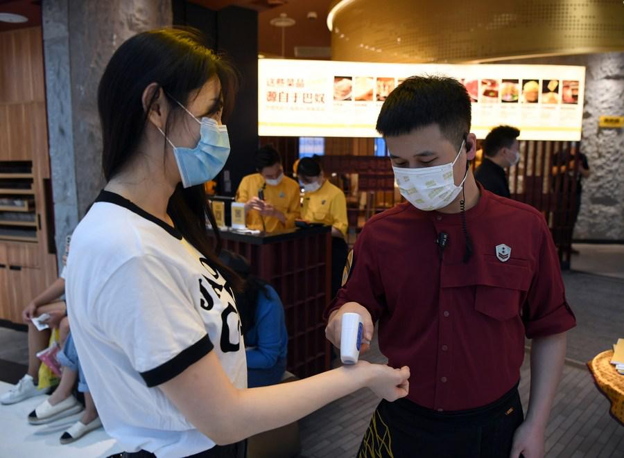 A customer has her body temperature checked as she enters a restaurant in Zhengzhou, central China's Henan Province, Aug. 29, 2021. (Xinhua/Li Jianan)