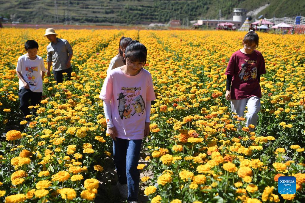 Tourists visit a flower farm in Lisai Village of Zho'nyin County in Gannan, northwest China's Gansu Province, Sept. 11, 2021. In recent years, the local government of Lisai Village has taken advantage of the natural resources to develop rural tourism and helped increase villagers' income. (Xinhua/Chen Bin)