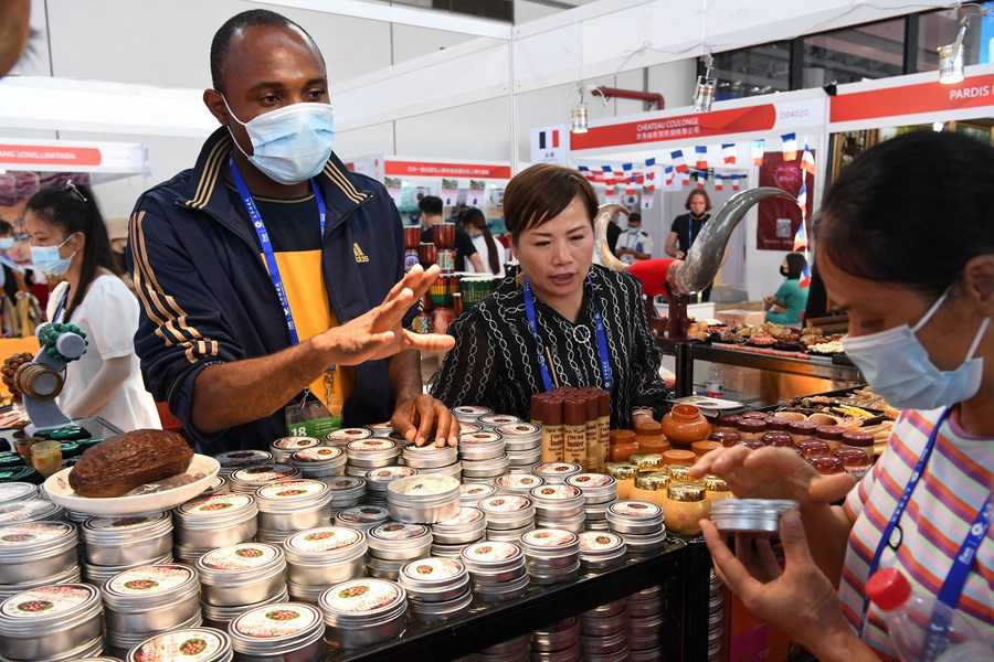 An exhibitor explains as a visitor tires Ghanaian products during the 18th China-ASEAN Expo in Nanning, capital of south China's Guangxi Zhuang Autonomous Region, Sept. 11, 2021. (Xinhua/Ma Ning)