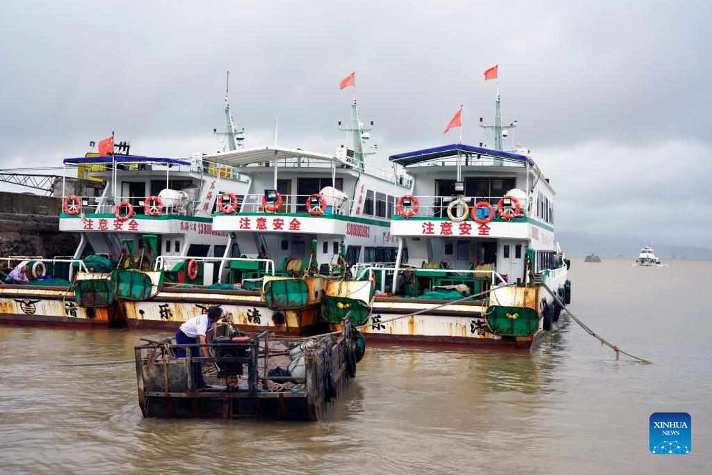 Fishing boats dock at Nanyue port in Yueqing, east China's Zhejiang Province, Sept. 12, 2021. China's national observatory on Sunday continued its orange alert for Typhoon Chanthu, which is expected to make landfall in or pass east China's Zhejiang Province during the daytime on Monday. (Photo by Cai Kuanyuan/Xinhua)