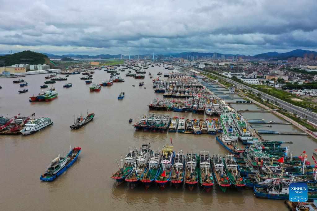 Aerial photo taken on Sept. 12, 2021 shows fishing boats docking at Shenjiamen fishing port in Zhoushan, east China's Zhejiang Province. East China's Zhejiang Province and Shanghai have issued alerts for Typhoon Chanthu, which is expected to make landfall on Zhejiang's coastal areas Monday. (Photo by Zhang Lei/Xinhua)