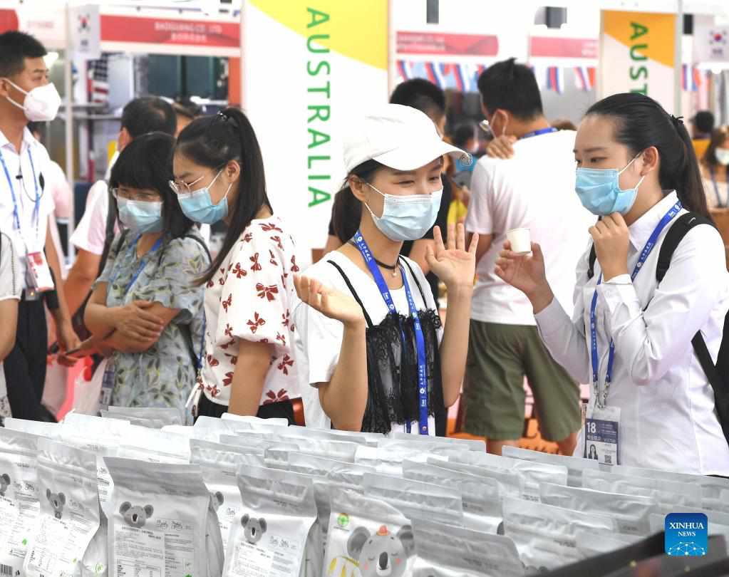 Visitors try Australian food during the 18th China-ASEAN Expo in Nanning, capital of south China's Guangxi Zhuang Autonomous Region, Sept. 12, 2021. The 18th China-ASEAN Expo and China-ASEAN Business and Investment Summit kicked off Friday in Nanning, highlighting the building of a closer China-ASEAN community with a shared future. This year's expo continues to set "Belt and Road" International Pavilion for countries outside ASEAN, with about 120 enterprises from 30 countries participating in the expo. (Xinhua/Zhou Hua)