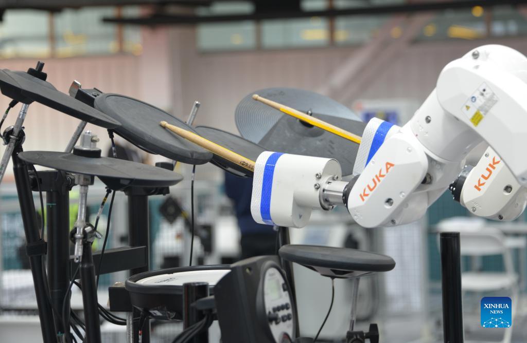 Photo taken on Sept. 10, 2021 shows a musical robot displayed at the World Robot Conference held in Beijing, capital of China. The 2021 World Robot Conference is held in Beijing from Sept. 10 to 13. More than 110 enterprises and scientific research institutions brought over 500 products to the exhibition. (Xinhua/Li Xin)
