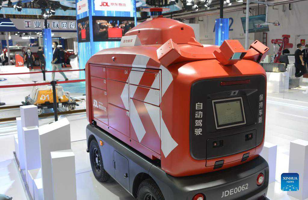 Photo taken on Sept. 10, 2021 shows an unmanned delivery car displayed at the World Robot Conference held in Beijing, capital of China. The 2021 World Robot Conference is held in Beijing from Sept. 10 to 13. More than 110 enterprises and scientific research institutions brought over 500 products to the exhibition. (Xinhua/Li Xin)