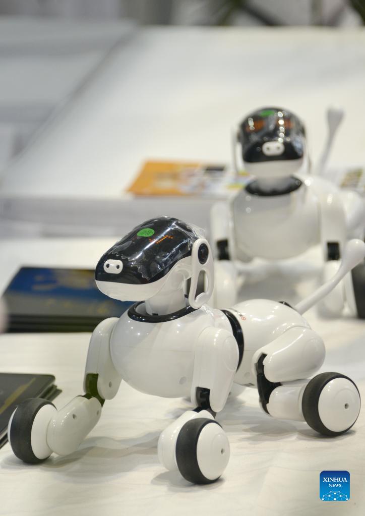 Photo taken on Sept. 10, 2021 shows robot toys displayed at the World Robot Conference held in Beijing, capital of China. The 2021 World Robot Conference is held in Beijing from Sept. 10 to 13. More than 110 enterprises and scientific research institutions brought over 500 products to the exhibition. (Xinhua/Li Xin)