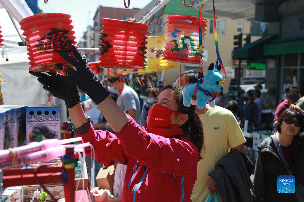 A visitor selects paper lanterns during the 31st Mid-Autumn Festival fair in Chinatown in San Francisco, the United States, Sept. 11, 2021. The two-day event is held to hail the Chinese Mid-Autumn Festival, which will fall on Sept. 21 this year. The fair was closed last year because of the COVID-19 pandemic. (Photo by Liu Yilin/Xinhua)