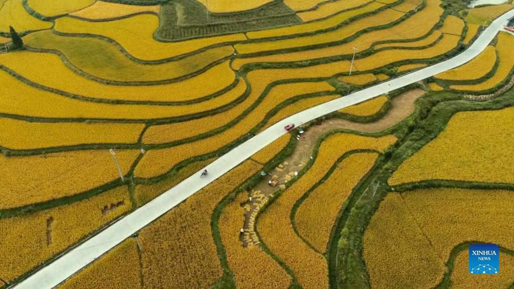 Aerial photo taken on Sept. 12, 2021 shows farmers harvesting paddy rice in Jinpi Village of Wantanhe Township in Longli County, southwest China's Guizhou Province. (Photo by Long Yi/Xinhua)