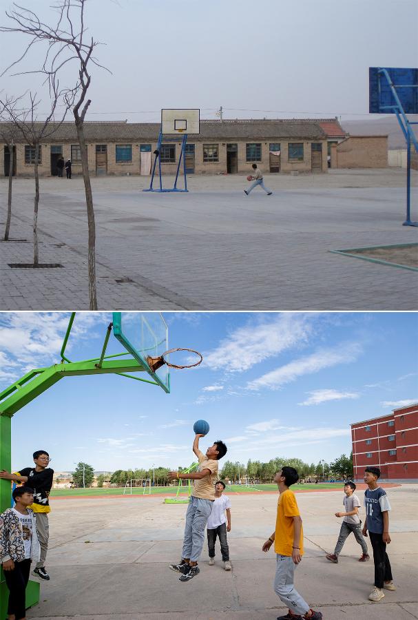 Combo photo taken in Nov. 2007 (top, file photo) and on June 21, 2021 (bottom, taken by Yang Zhisen) shows the basketball court of Tongxin No. 3 Middle School in Yuwang Township of Tongxin County, northwest China's Ningxia Hui Autonomous Region. (Xinhua)