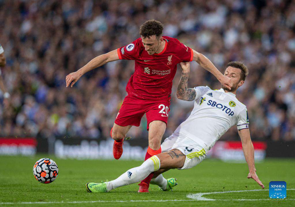 Liverpool's Diogo Jota (L) is tackled by Leeds United's Liam Cooper during the Premier League football match between Leeds United and Liverpool in Leeds, Britain, on Sept. 12, 2021. (Xinhua)