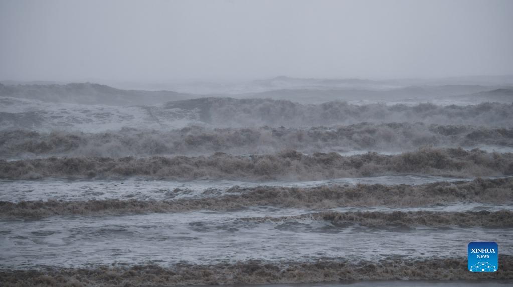 Photo taken on Sept. 13, 2021 shows high waves brought by Typhoon Chanthu near Dongsha scenic area of Zhoushan, east China's Zhejiang Province. East China's Zhejiang Province has upgraded its emergency response to Typhoon Chanthu to the highest level, closing schools as well as suspending air and rail services in several cities. (Xinhua/Xu Yu)