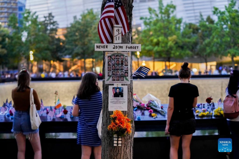 People mourn for the victims at the National September 11 Memorial & Museum in New York, the United States, Sept. 11, 2021. (Xinhua/Wang Ying)