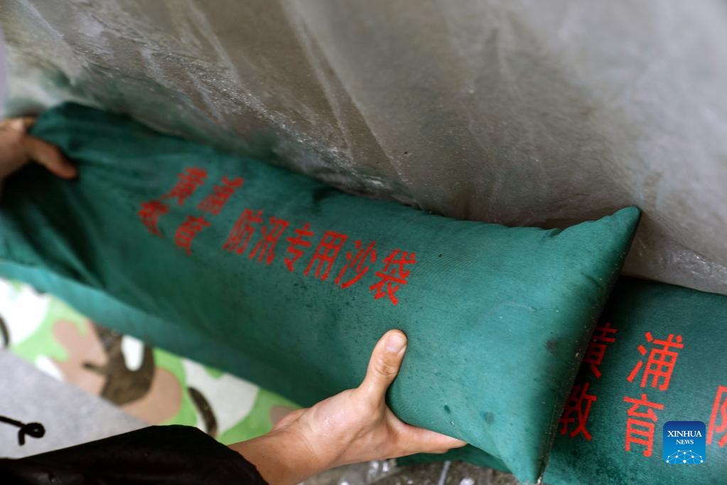 A staff member puts sand bags to reinforce flood defence at a primary school in Huangpu District, east China's Shanghai, Sept. 13, 2021. Shanghai has ordered kindergartens, primary and high schools to suspend classes from Monday afternoon to Tuesday as the city braces for heavy rains and strong winds due to Typhoon Chanthu. (Xinhua/Liu Ying)