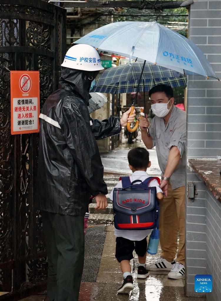 A security staff member sends a student to the gate of a primary school in Huangpu District, east China's Shanghai, Sept. 13, 2021. Shanghai has ordered kindergartens, primary and high schools to suspend classes from Monday afternoon to Tuesday as the city braces for heavy rains and strong winds due to Typhoon Chanthu. (Xinhua/Liu Ying)