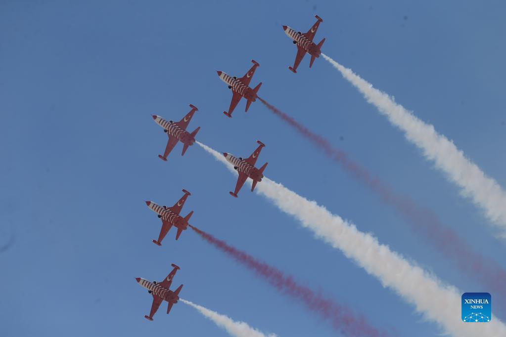 Aircraft perform during the Sivrihisar Airshow 2021 in Sivrihisar district of Eskisehir in Turkey, on Sept. 12, 2021. The Sivrihisar Airshow, which is organized annually by Sivrihisar Sportive Aviation Society, kicked off here on Sunday. (Photo by Mustafa Kaya/Xinhua)