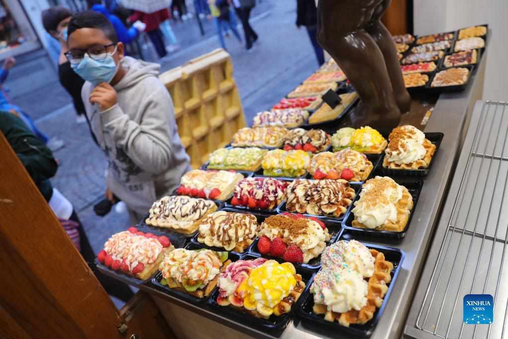 A boy walks past a food shop that sells Belgian waffle in central Brussels, Belgium, Sept. 10, 2021. (Xinhua/Zheng Huansong)