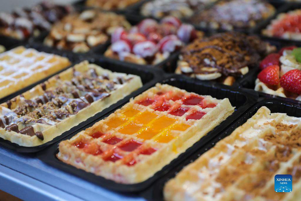 The Belgian waffle is seen at a food shop in central Brussels, Belgium, Sept. 10, 2021. (Xinhua/Zheng Huansong)