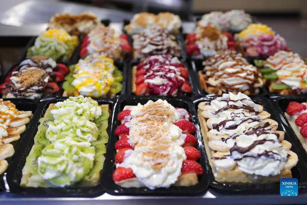 The Belgian waffle is seen at a food shop in central Brussels, Belgium, Sept. 10, 2021. (Xinhua/Zheng Huansong)