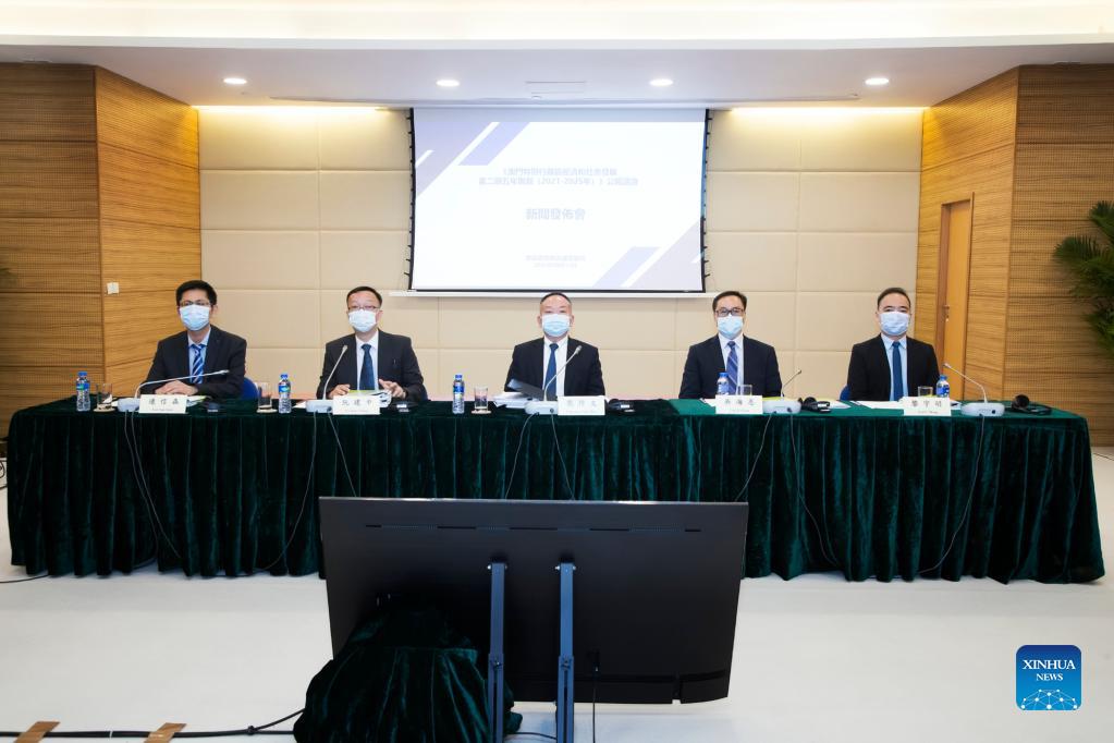 The Macao Special Administrative Region (SAR) government releases the development goals of its second five-year plan on economic and social development from 2021 to 2025, in Macao, south China, Sept. 13, 2021. The goals for this period are to continuously strengthen the driving force of development, vitality and competitiveness of Macao so as to build a modern, beautiful, happy, safe and harmonious Macao, according to the Policy Research and Regional Development Bureau under the SAR government. (Xinhua)