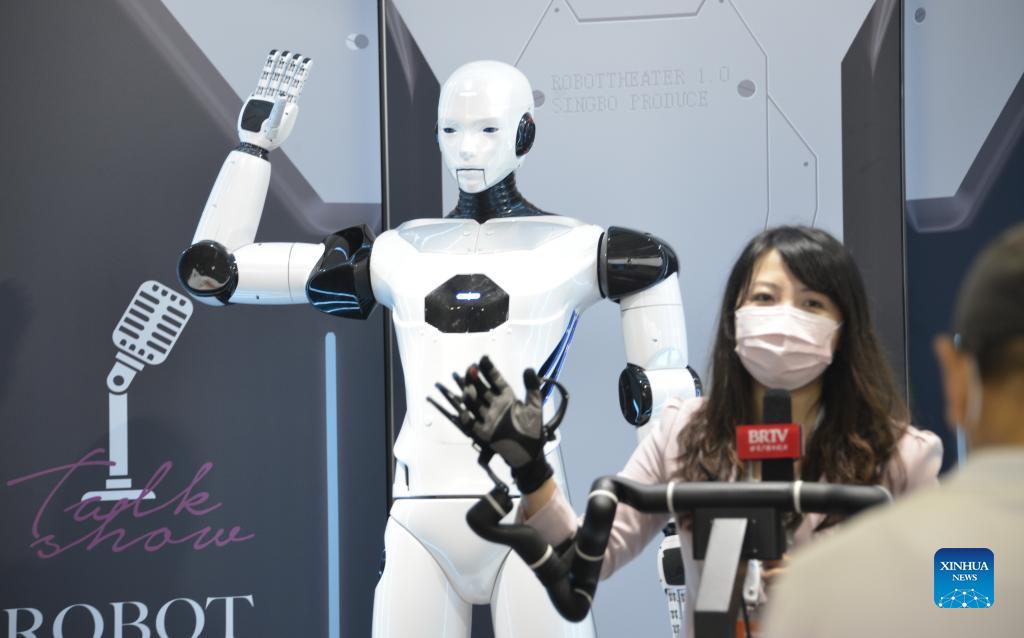 A reporter interacts with an intelligent robot actor at the World Robot Conference held in Beijing, capital of China, Sept. 12, 2021. The 2021 World Robot Conference is held in Beijing from Sept. 10 to 13. More than 110 enterprises and scientific research institutions brought over 500 products to the exhibition. (Xinhua/Li Xin)