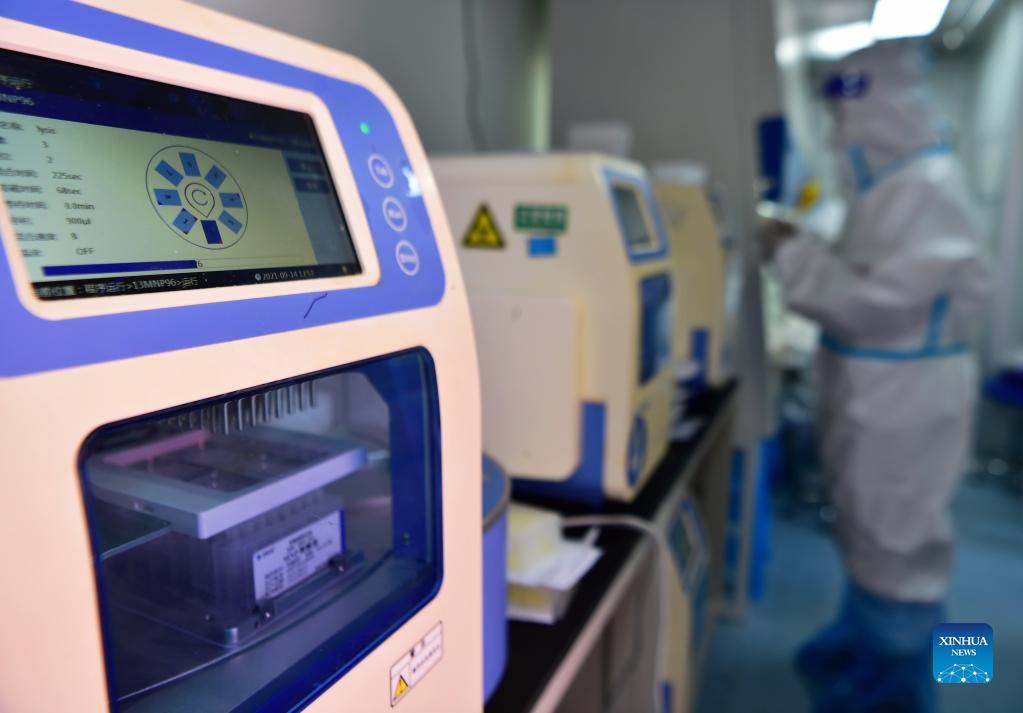 A staff member works in a PCR (polymerase chain reaction) lab for nucleic acid testing in Xianyou County, southeast China's Fujian Province, Sept. 14, 2021. Three PCR labs have been built in the county to boost nucleic acid detection capacity. (Xinhua/Wei Peiquan)