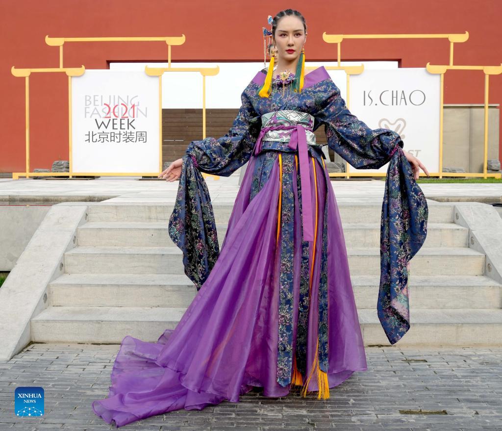 A model presents a creation designed by Zhang Yichao during the Beijing Fashion Week in Beijing, capital of China, Sept. 15, 2021. The 12-day event kicked off in Beijing on Wednesday. (Xinhua/Chen Jianli)
