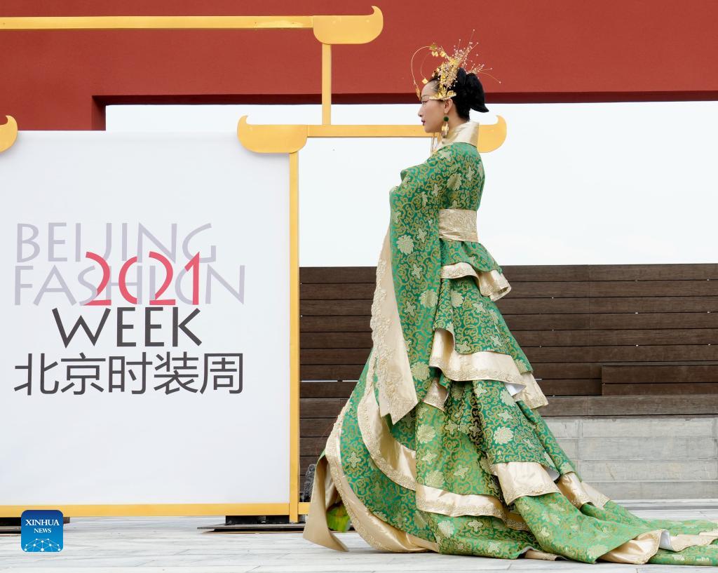 A model presents a creation designed by Zhang Yichao during the Beijing Fashion Week in Beijing, capital of China, Sept. 15, 2021. The 12-day event kicked off in Beijing on Wednesday. (Xinhua/Chen Jianli)