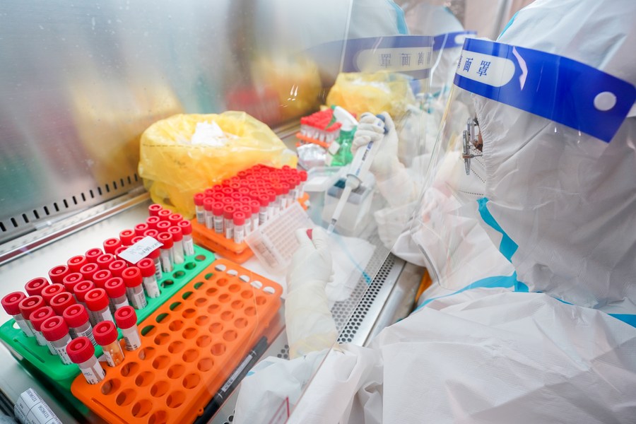 A medical worker operates at a "Falcon" air-inflated testing lab for COVID-19 nucleic acid testing at Yangzhou International Exhibition Center in Yangzhou, east China's Jiangsu Province, Aug. 14, 2021. (Xinhua/Li Bo)