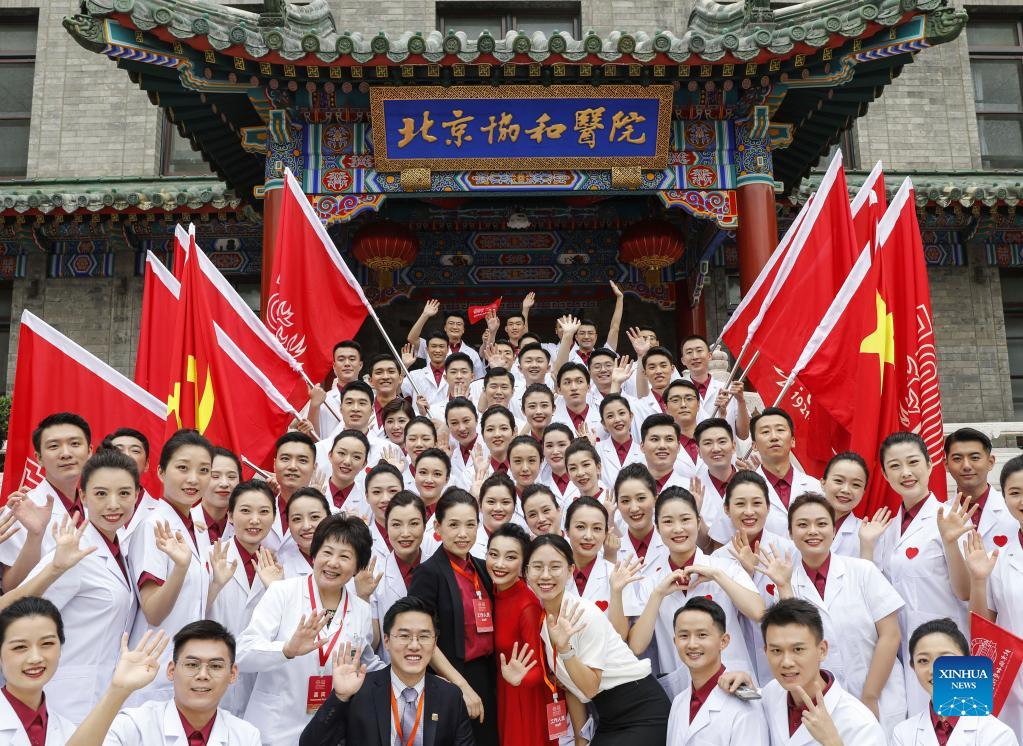 Medical workers pose for photos after a celebration marking the 100th anniversary of the founding of Peking Union Medical College Hospital (PUMCH) in Beijing, capital of China, Sept. 16, 2021. (Xinhua/Zhang Yuwei)