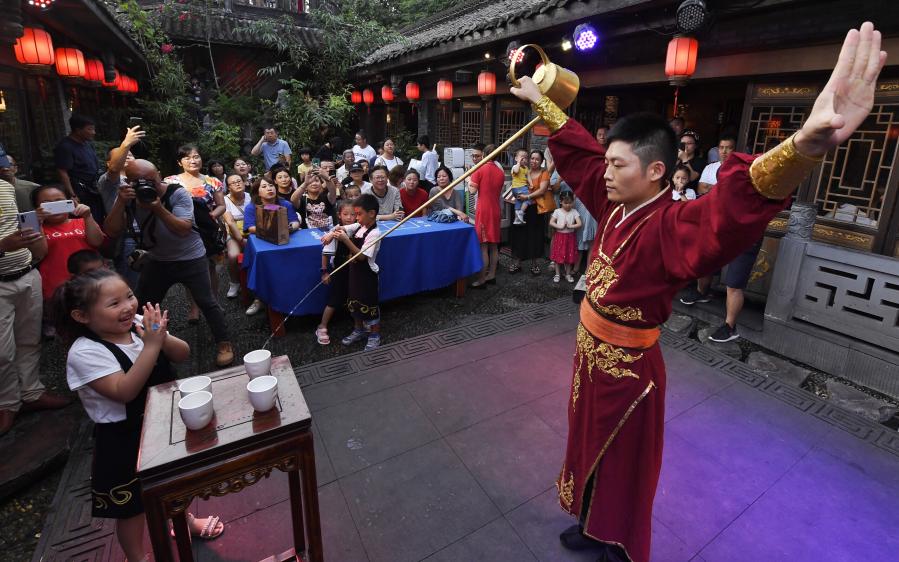 People watch a tea performance at the Kuanzhai Lane Historic District in Chengdu, the capital city of southwest China's Sichuan Province, on Aug. 4, 2019. (Xinhua/Liu Kun)