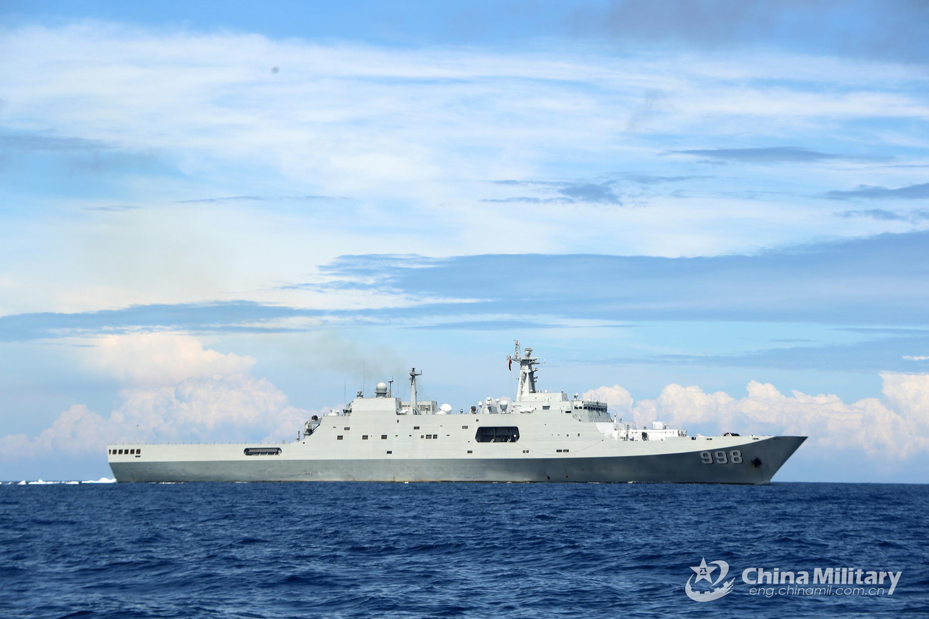 The amphibious transport dock landing ship Kunlunshan (Hull 998) attached to a landing ship flotilla with the navy under the PLA Southern Theater Command sails on the water during a recent maritime training exercise. (eng.chinamil.com.cn/Photo by Zhao Xiaowei)