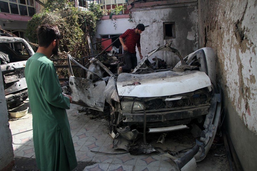 Photo taken on Sept. 2, 2021 shows a damaged vehicle at the site of the U.S. airstrike in Kabul, capital of Afghanistan. (Photo by Saifurahman Safi/Xinhua)
