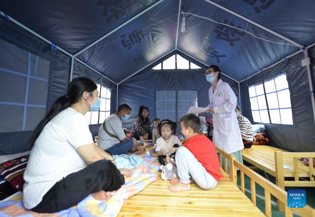 A medical worker teaches knowledge about post-earthquake epidemic prevention to residents at a temporary shelter in Fuji Township of Luxian County, southwest China's Sichuan Province, Sept. 17, 2021. China has earmarked 30 million yuan (about 4.65 million U.S. dollars) from its central disaster-relief budget to the southwest province of Sichuan after a 6.0-magnitude earthquake jolted the region's Luxian County in the city of Luzhou on Thursday. (Xinhua/Liu Kun)