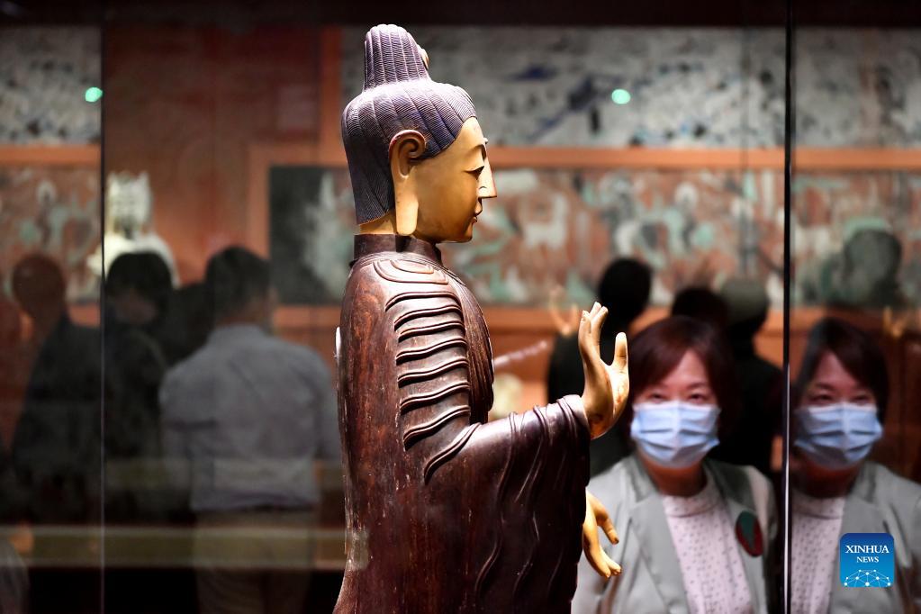 People visit an exhibition themed on Dunhuang culture at the Palace Museum, also known as the Forbidden City, in Beijing, capital of China, Sept. 17, 2021. (Xinhua/Li Xin)