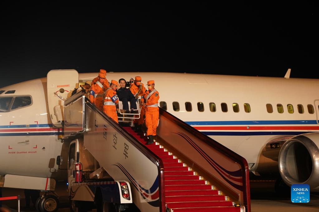 Astronaut Tang Hongbo waves to the crowd on his arrival in Beijing, capital of China, Sept. 17, 2021. Three Chinese astronauts, the first sent to orbit for space station construction, have completed their three-month mission and returned to Earth safely on Friday. They arrived in Beijing by plane Friday night. (Photo by Guo Zhongzheng/Xinhua)