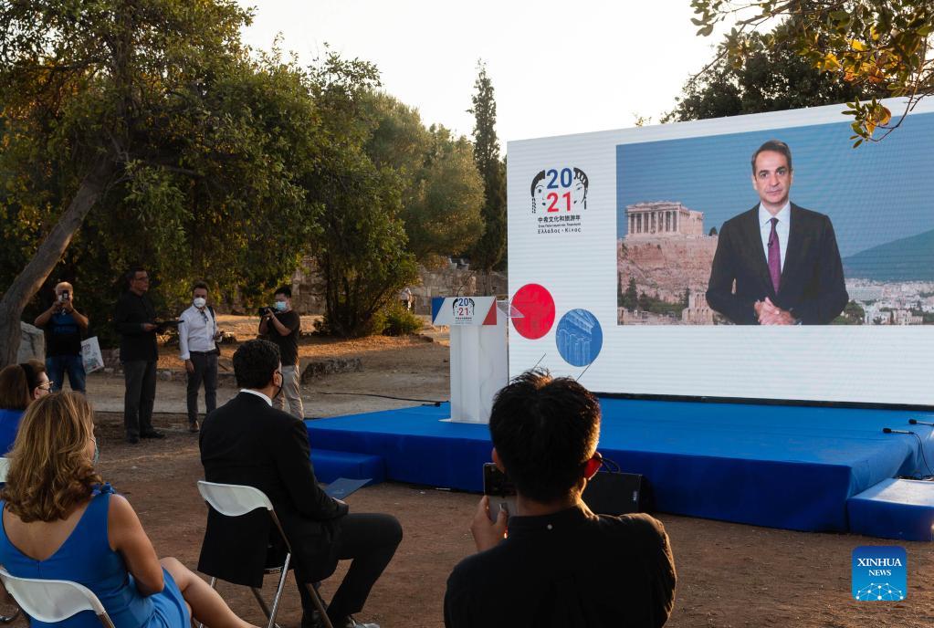 Greek Prime Minister Kyriakos Mitsotakis speaks in a video message at the opening ceremony of the China-Greece Year of Culture and Tourism, in Athens, Greece on Sept. 16, 2021. The China-Greece Year of Culture and Tourism opened on Thursday with a ceremony held at the foot of the Athens Acropolis, as officials of both sides expressed confidence in a stronger friendship and further cooperation between the two peoples. (Xinhua/Marios Lolos)