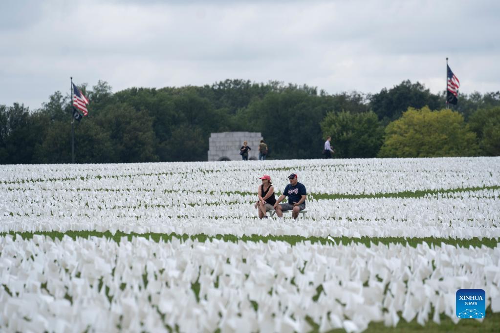 Visitors sit beside white flags on the National Mall in Washington, D.C., the United States, on Sept. 17, 2021. More than 660,000 white flags were installed here to honor the lives lost to COVID-19 in the United States. (Xinhua/Liu Jie)