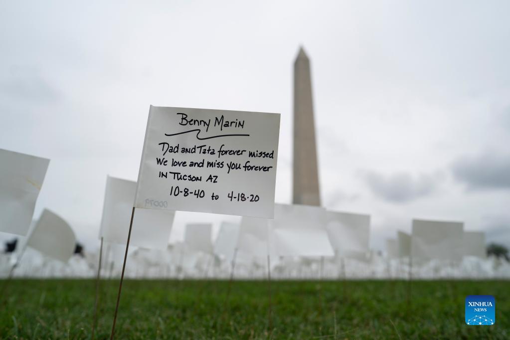 White flags are seen on the National Mall in Washington, D.C., the United States, on Sept. 17, 2021. More than 660,000 white flags were installed here to honor the lives lost to COVID-19 in the United States. (Xinhua/Liu Jie)