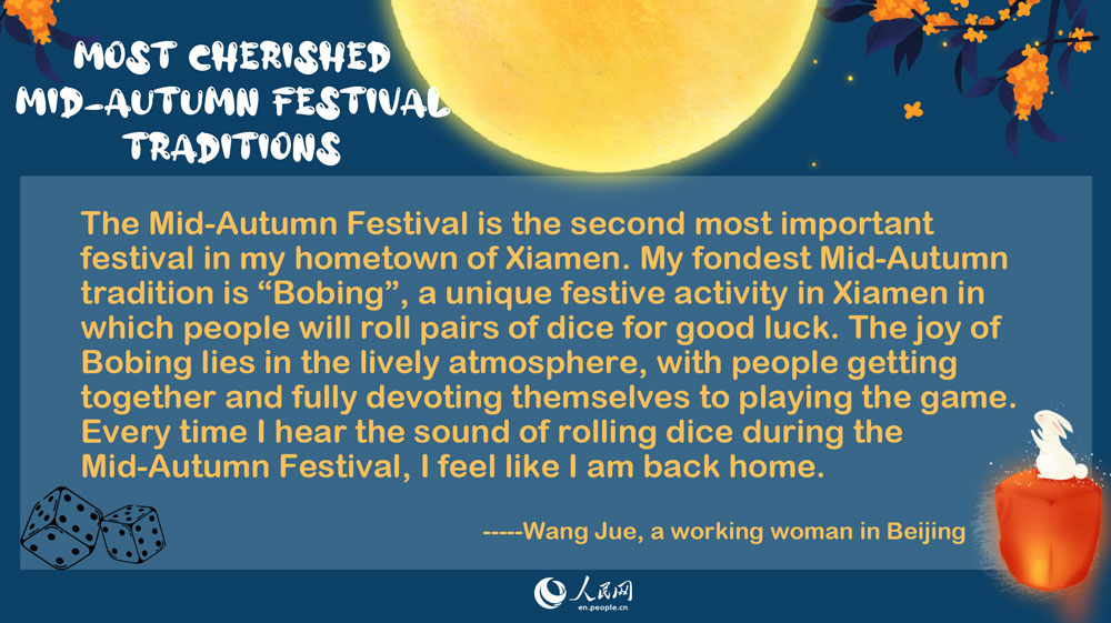 "Bobing is my fondest Mid-Autumn tradition as it is a time to make merry with families and friends," said Wang. "Everyone is excited during the game. The joy of Bobing lies in the lively atmosphere where people gather together and are fully devoted to the game."