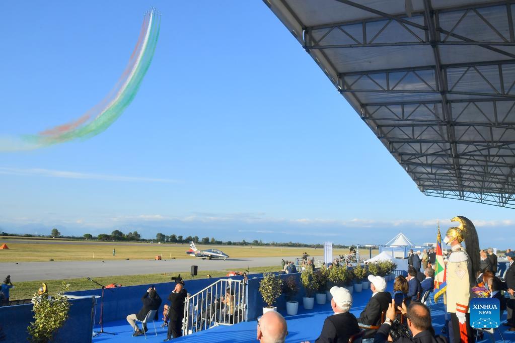 People watch a performance of the Italian Frecce Tricolori aerobatic squad during an airshow in Rivolto, Italy, on Sept. 18, 2021. The Italian Air Force held the airshow to mark the 60th anniversary of the Frecce Tricolori here on Saturday. (Str/Xinhua)