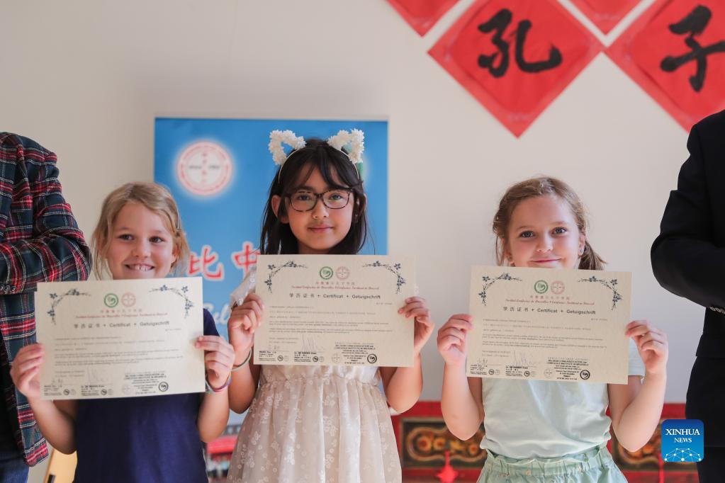 Students hold their Chinese learning certificates during a ceremony at the Confucius Institute in Brussels, Belgium, on Sept. 18, 2021. The Confucius Institute in Brussels held an open day on Saturday, with activities like paper cutting, the game of go, and Qigong, attracting visitors to get a taste of the Chinese culture. (Xinhua/Zheng Huansong)