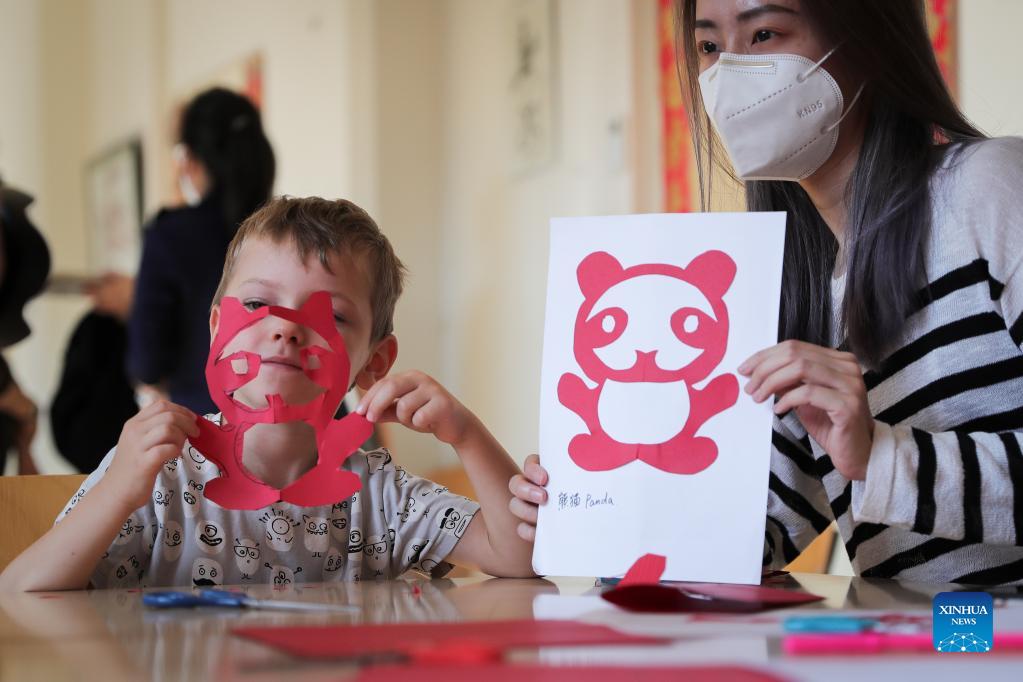 A boy shows a paper-cutting work at the Confucius Institute in Brussels, Belgium, on Sept. 18, 2021. The Confucius Institute in Brussels held an open day on Saturday, with activities like paper cutting, the game of go, and Qigong, attracting visitors to get a taste of the Chinese culture. (Xinhua/Zheng Huansong)