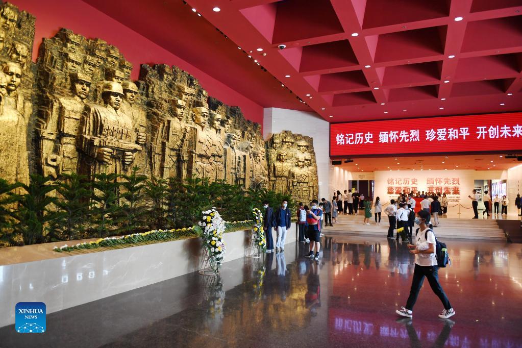 Visitors present flowers to pay tribute to revolutionary martyrs at the Museum of the War of Chinese People's Resistance Against Japanese Aggression in Beijing, capital of China, Sept. 18, 2021. Various activities are held on Sept. 18 in commemoration of the September 18 Incident 90 years ago that marked the start of Japan's 14-year invasion of China. (Xinhua/Zhang Chenlin)
